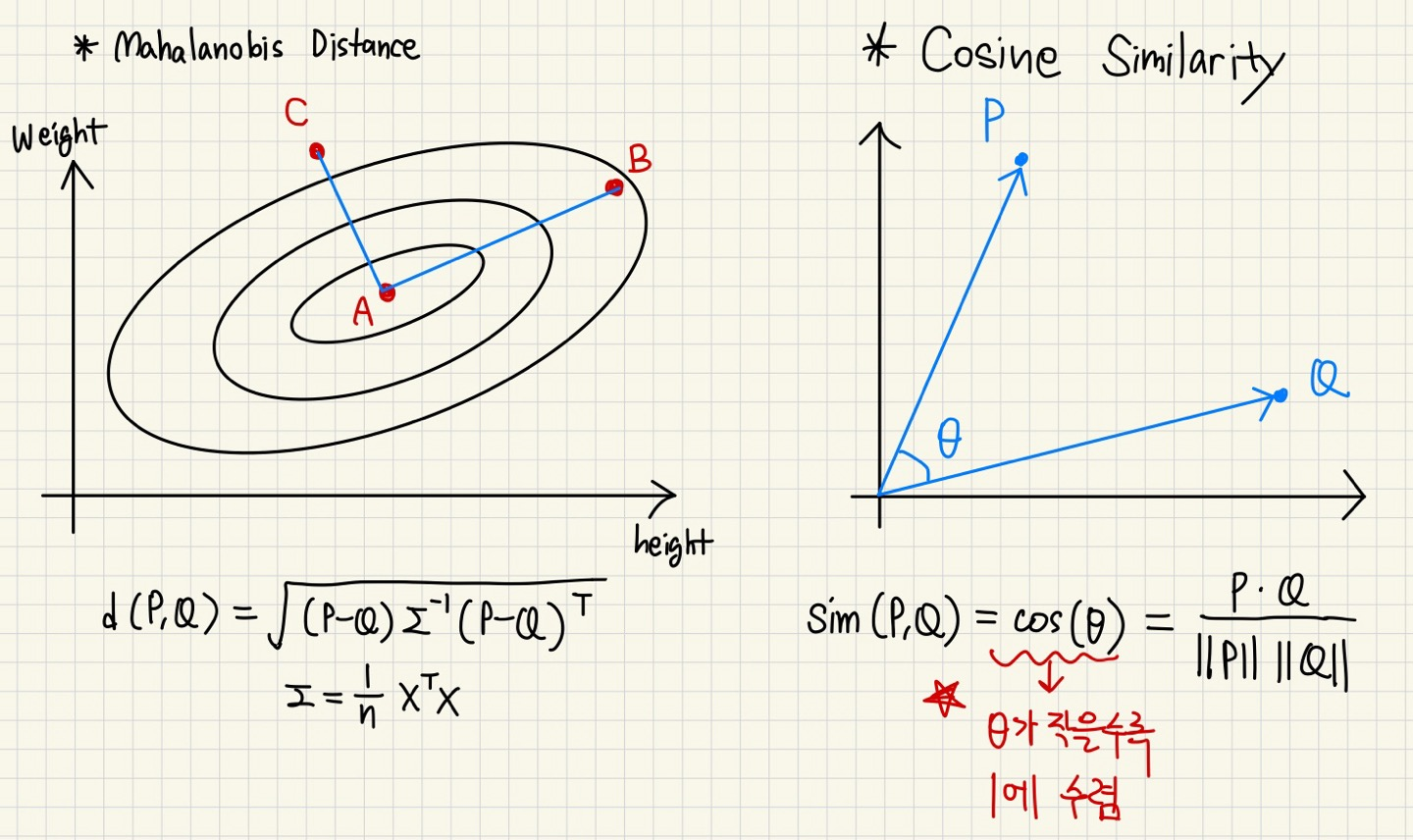 - Manhattan distance, Euclidean distance, Mahalanobis distance, Cosine similarity 계산 방식.