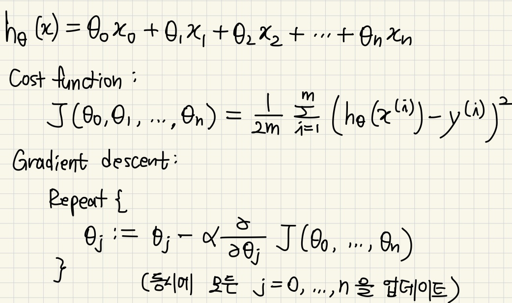 n = 피처 개수, x^(i) = i번째 training example의 input 피처, {x(j)}^(i) = i번째 training example의 j번째 피처
