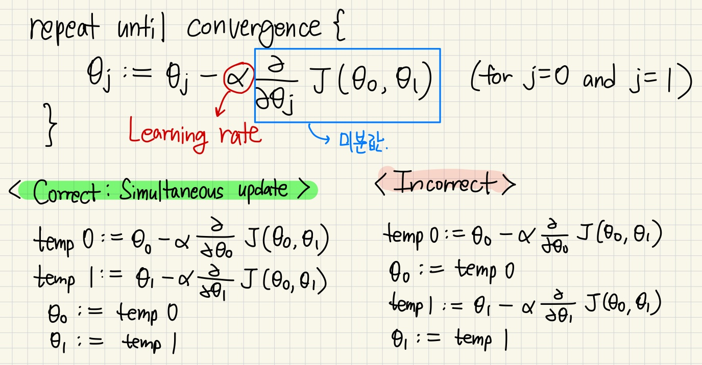 - Learning rate α가 너무 크면, gradient descent는 최소값을 overshoot하여 수렴에 실패할 수 있음.