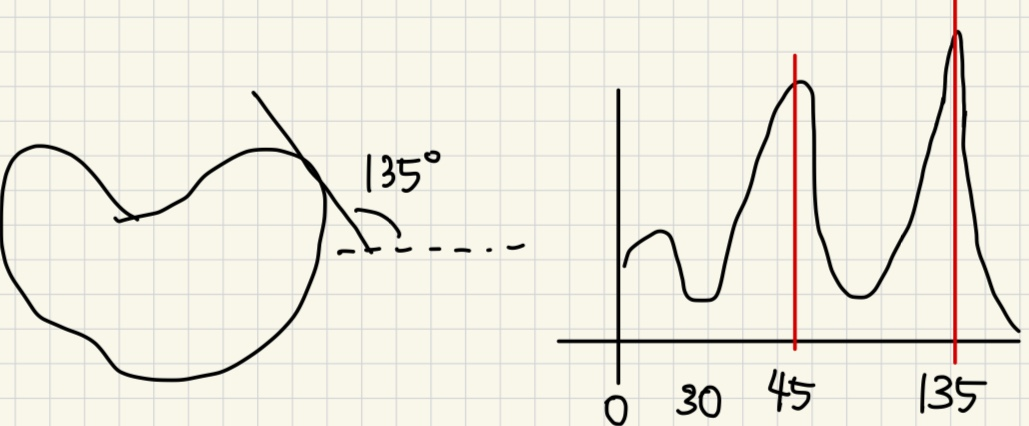 - 센터를 지나는 무수히 많은 직선을 그릴 수 있지만, 그 중에서 거리차가 가장 적은 것이 orientation.