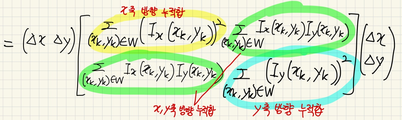 - 이미지에서 Window가 4가지 방향으로 이동하며, 이들 간의 차이를 계산. → (1,0),(0,1)(1,1),(-1,1)