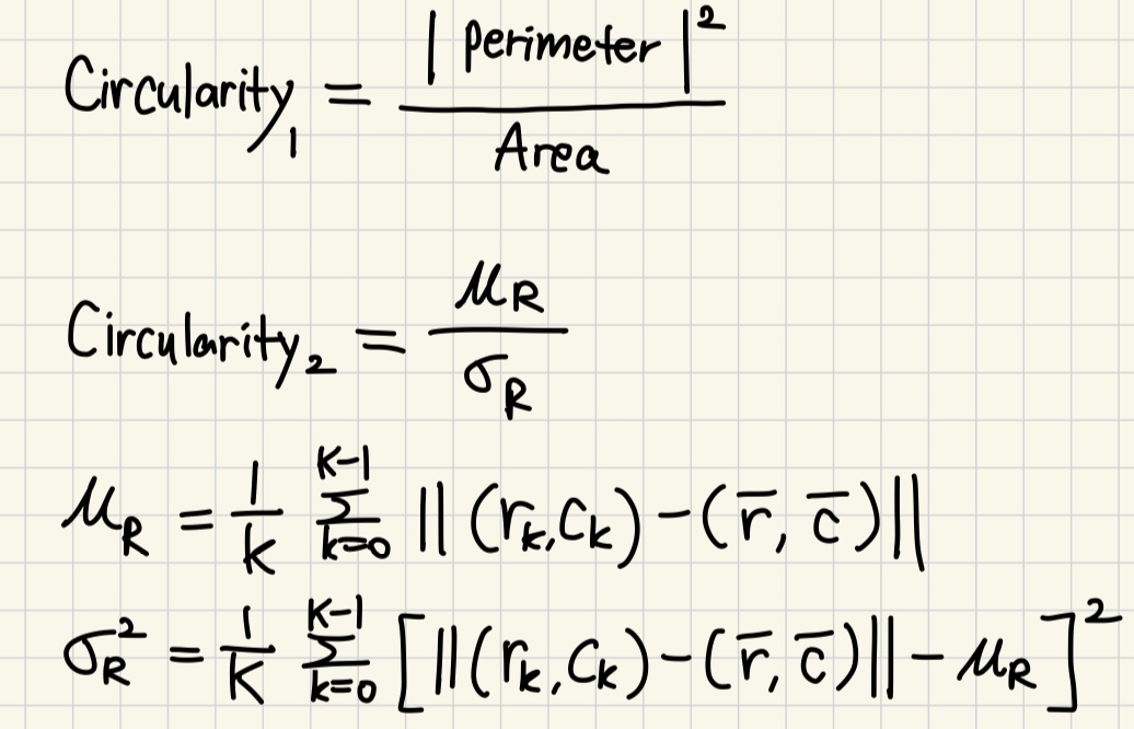 - Circularity1: 원에 가까울수록 둘레는 줄어듬.