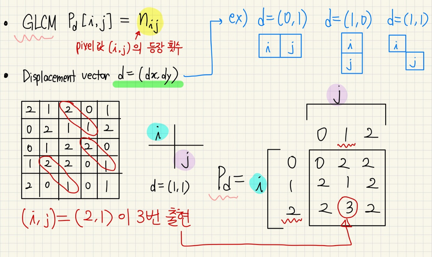 - GLCM에서 Displacement vector를 고르는 것은 매우 중요하며, 값을 선택할 때 아래 식을 사용해도 됨.